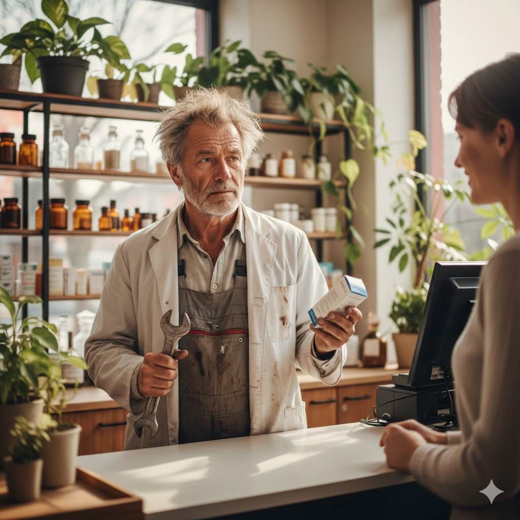 Ein älterer Mann in einem Mechaniker-Overall und einem Laborkittel hält einen Schraubenschlüssel und eine Medikamentenschachtel in der Hand. Er unterhält sich mit einer Frau am Apothekentresen, der von Pflanzen und Medikamentenflaschen umgeben ist, wahrscheinlich über Medikamentenpreise.