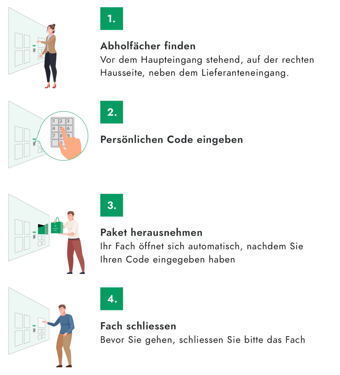Anleitung in vier Schritten zeigt, wie Sie mit dem Medikamentenautomaten rund um die Uhr Medikamente abholen: 1. Abholfach finden, 2. persönlichen Code eingeben, 3. Paket entnehmen, 4. Fach schließen - mit Illustrationen und kurzen Texten auf Deutsch.